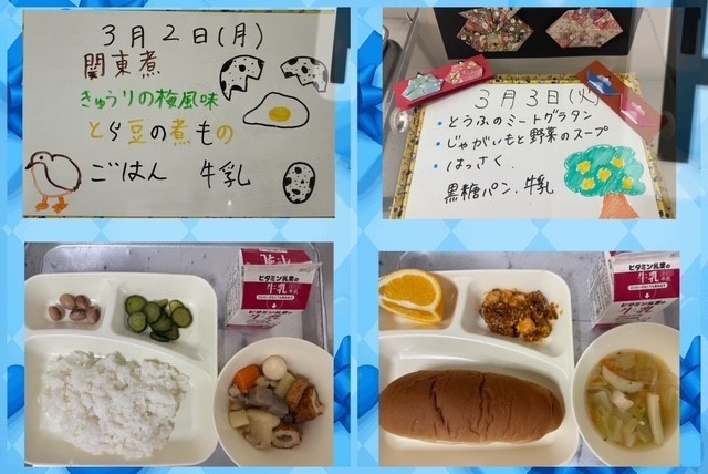 月曜日の『関東煮』は、鶏肉、うずら卵、ちくわ、じゃがいも、こんにゃく、あつあげ、だいこん、にんじんを使用しています。【卵】の除去食対応の献立となっています。