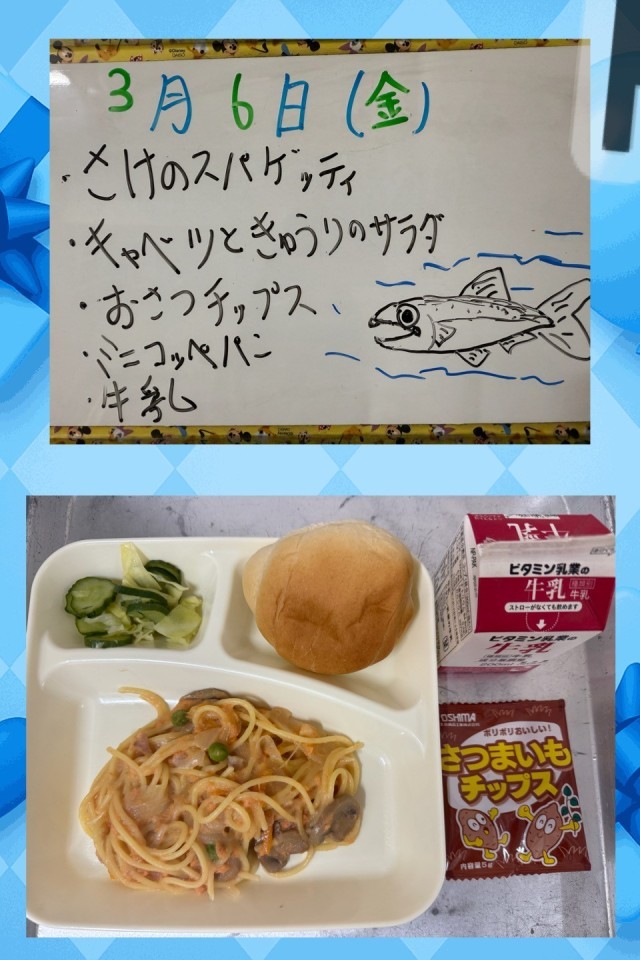 金曜日の『さけのスパゲッティ』は、紅ざけフレークを使用して春らしい淡いピンクいろに仕上げ、グリンピースで彩りを良くしています。今年度より、牛乳、クリームを使用せず、シチュールゥの素を使用することで、乳アレルギーの児童も食べることができる一品となっています。