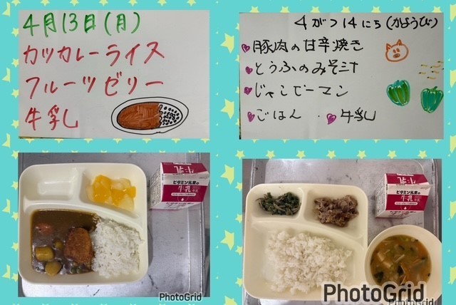 月曜日は入学祝い献立でした。『カツカレーライス』のカツは米粉のカツを使用し、小麦アレルギーの児童も食べることができます。