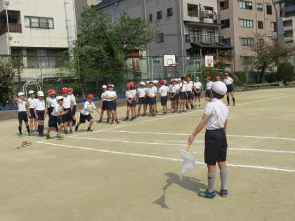 5年生が運動場で50m走の記録を測っていました。「11秒やった!」「10秒を切ったで!」いろいろな声が聞こえてきました。みんな自分を記録を伸ばそうと一生懸命に走っていました。