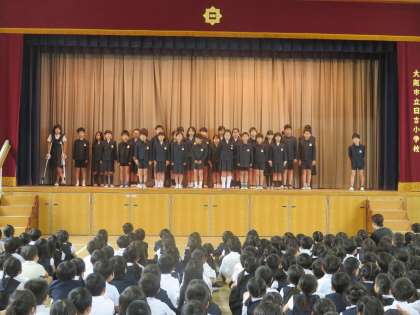 今日は、今年度最初の児童集会を講堂で行いました。