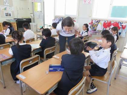 1年生にとっては、初めての『名前の日』です。ふでばこの中に入っているものにちゃんと名前が書いているか点検していました。