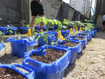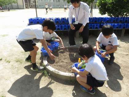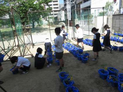 2年生が、1年生の時にアサガオを植えていた植木鉢にミニトマトの苗を植え、日当たりのいい運動場に運んでいました。