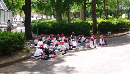 待ちに待ったお弁当タイムです。日陰を見つけ、みんなで楽しくおしゃべりしながら食べています。