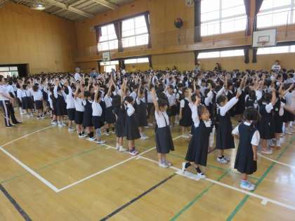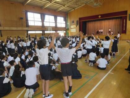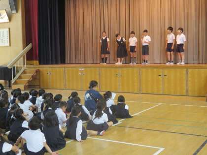 今日は3年生が遠足でしたが、それ以外の学年は講堂に集まって児童集会をしました。