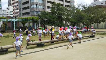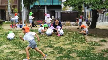 日吉幼稚園の園児さんたちが、小学校の広い運動場で、のびのびと遊んでいます。