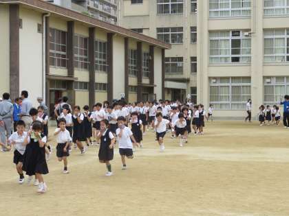 まず、午前9時から児童の避難訓練を行いました。理科室から火災が発生したという想定です。