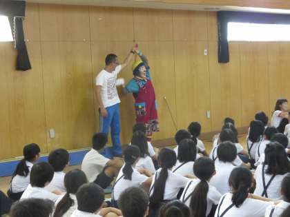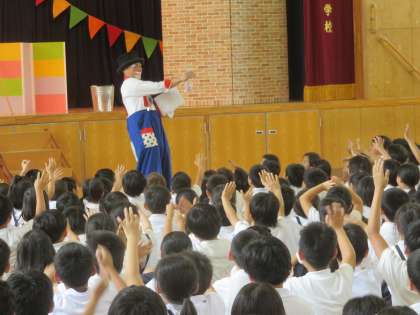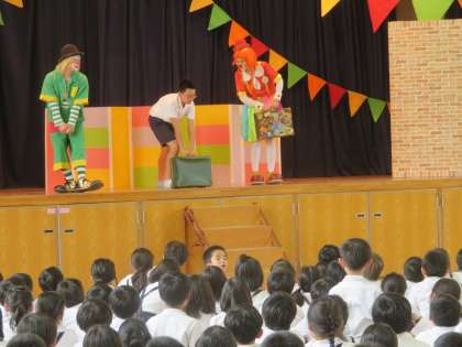クラウンサーカスオフィスパフォーマンスラボの方に来ていただき、子どもたちにパントマイムを見せてもらいました。