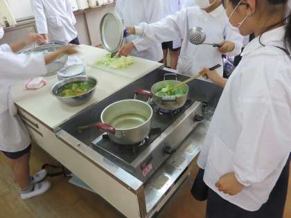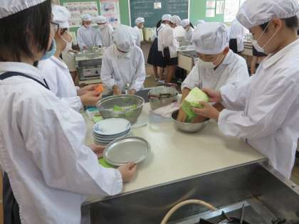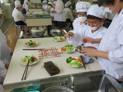 5年生が家庭科室で調理実習をしていました。今日のメニューは『ゆで野菜サラダ(和風ドレッシング添え)』です。