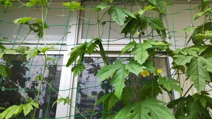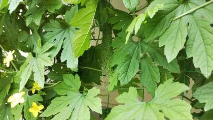花が咲き、実ができつつあります。よく見ると少し大きくなったゴーヤが見えますよ。