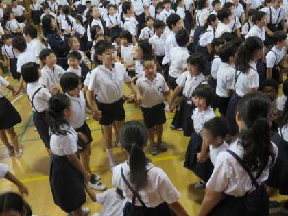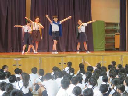 今日の児童集会は『音楽集会』で“おもちゃのチャチャチャ”をしました。