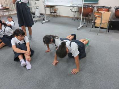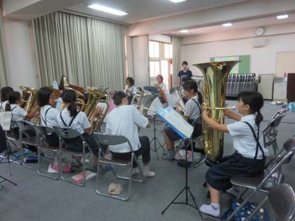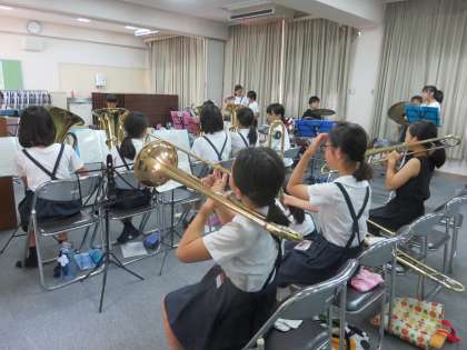 日吉小学校では、プール開放と並行して多目的室で『ブラスバンド部』を練習をしています。