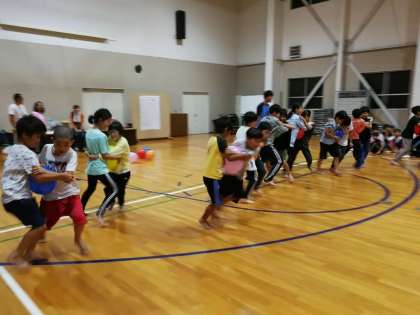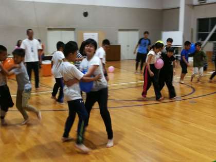 手を使わずに、二人で協力して風船を運び、最後は、その風船を割ります。