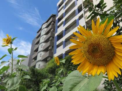 校庭の“ひまわり”は2m以上の高さとなり、炎天下の青空のもと、風になびきながら悠然とした姿で迎えてくれています。