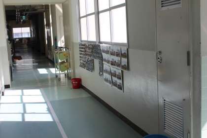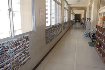 5年「林間学習」、6年「自然体験学習」の写真を、各学年教室前の廊下に掲示しています。
