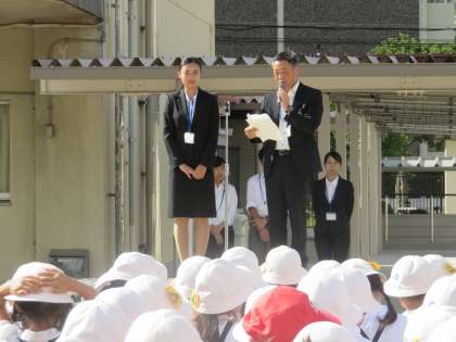 今日来られた4名全員に、全校朝会であいさつしてもらいました。