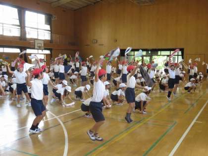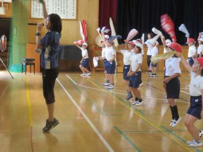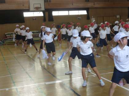 先生の指示のもと、ステップを踏んだりタオルを勢いよく回したりして踊っていました。