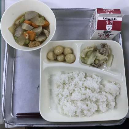 給食では、十五夜が「芋名月」といわれることや、さといもを供える習慣があることから、さといもを使用しています。