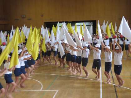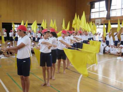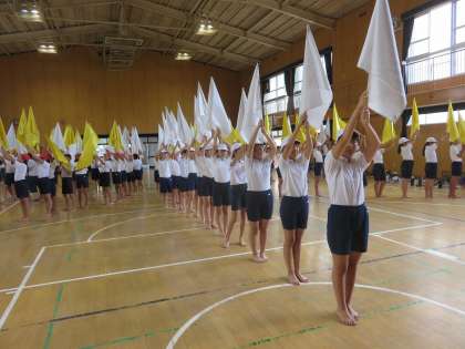 6年生が、旗(フラッグ)を使って団体演技の練習をしていました。