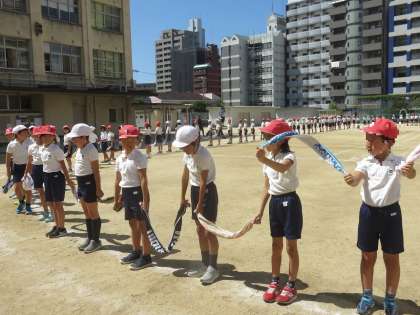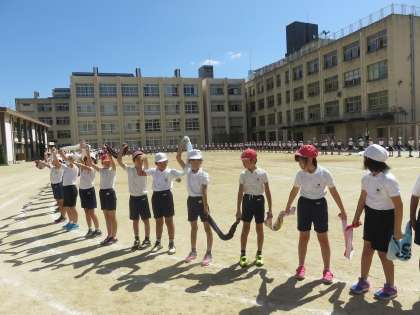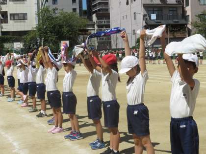 一人一人手にタオルを持って、ウェーブを作ったり回して演技をしたりしていました。当日は、クラスごとに違う色のカラータオルを持つそうです。