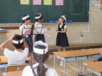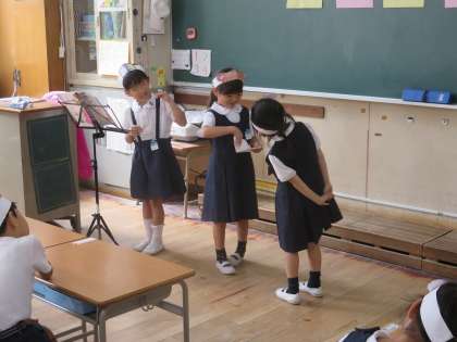 うさぎさんとくまさん、ナレーターの3人一組。音読が中心でしたが、手振り身振りも入って、1年生なりに表情豊かに演じていました。