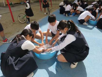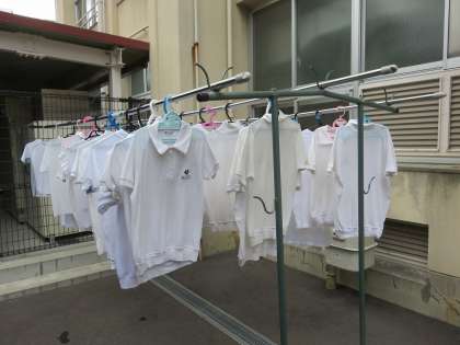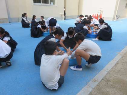 今日は6年生が、大きなタライに手をつっこんで、体操服を洗濯していました。