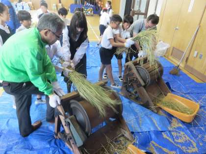 今日は、田植え、水やり(水中プランクトンの観察)、稲刈りに続き、脱穀体験を行いました。