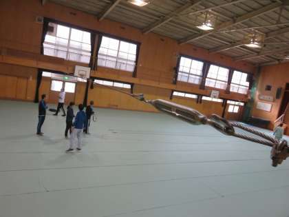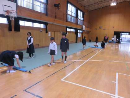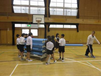 跳び箱などの教具をすべて移動させ、床を掃除したあとにシートを敷きました。5年生の子どもたちが進んで取り組んでくれたので、すぐにきれいに敷くことができました。