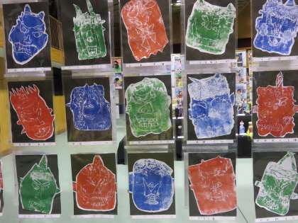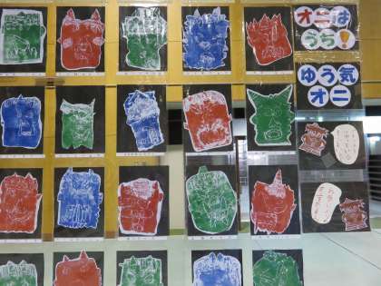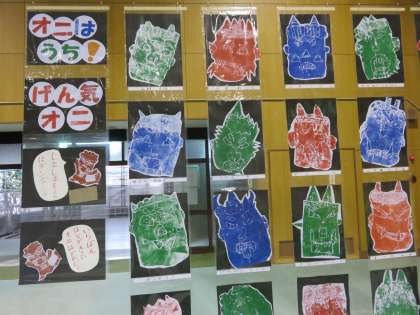 オニの角、きば、目の様子で、こわそうなオニもいれば、やさしそうなオニ、何となく微笑んでしまうオニなど、子どもたちがいろいろな思いを込めて作成したことがよく分かります。