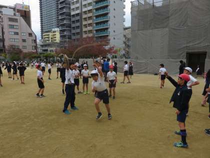 1年生が練習している周りでは、いろいろな学年の子どもたちが、大縄をしたり短縄でいろいろな回し方をして跳んだりしていました。