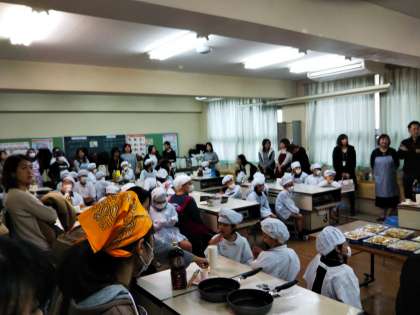 今日は、みんなで育てた「おいも」を使って、おとうさん、おかあさん、せんせいがたを招いての「おいもパーティー」です。