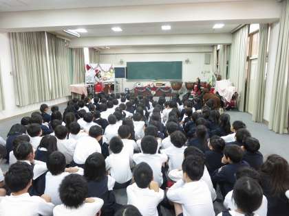 12月は、学年ごとに多目的室に集まって、特別な『読み聞かせ会』を行っていただきます。今日は2年生の番です。