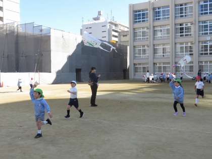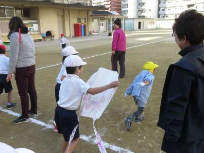 今日は、日吉幼稚園の子どもたちと1年生が、凧あげを通して楽しく交流をしました。