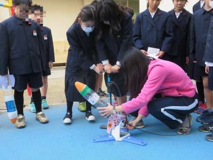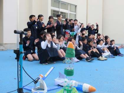 科学クラブは、みんなで呼びかけをしたあとに、ペットボトルロケットを飛ばしていました。