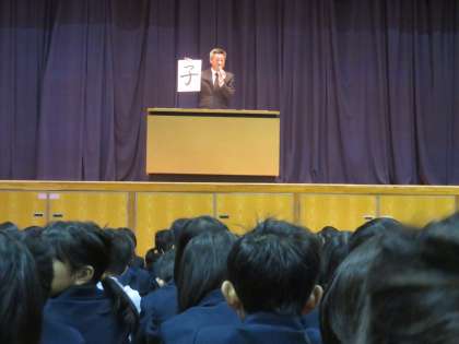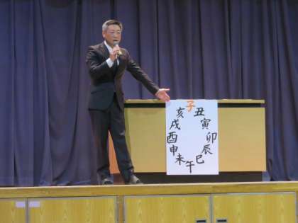 始業式では、干支の『子』(ね)の話や、12干にまつわる話をしました。