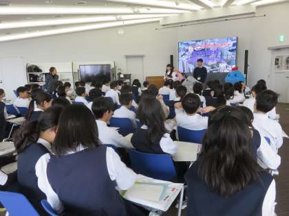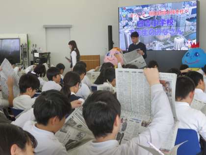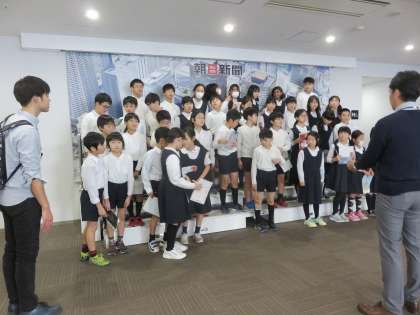 クラスごとに集合写真を撮った後は、ホールで実際に今日の朝刊を見ながら説明を受けました。