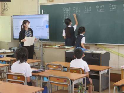 教室を回ってみると、4年生の教室では、学習課題の確認から、3ケタのひっ算の勉強としたり、概数の勉強をしたりしていました。