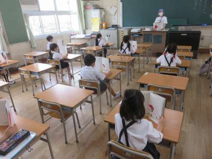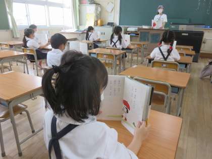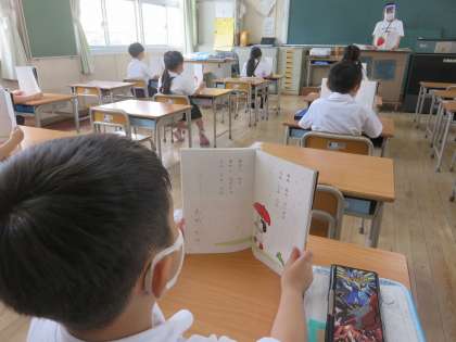 1年生が国語の授業で、教科書をみんなで読んでいました。