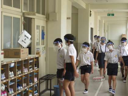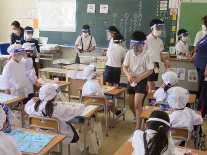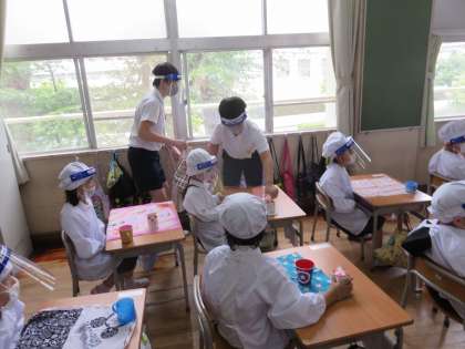 6年生が1年生の教室に、給食の牛乳やパン、おかずを運んでくれていました。