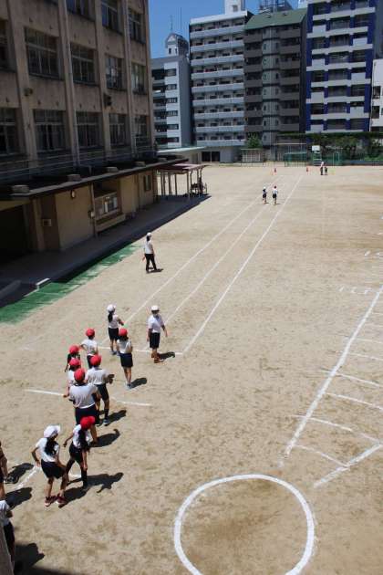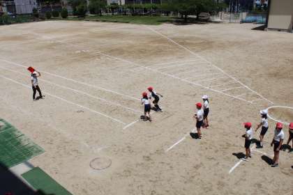 早速、4年生が50m走の記録を計っていました。子どもたちは、思い切り体を動かして、楽しそうでした。