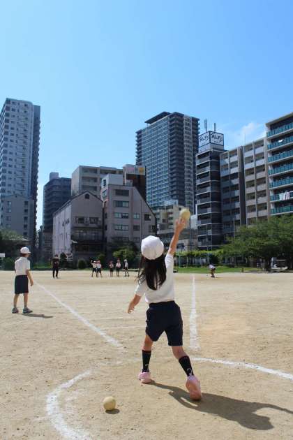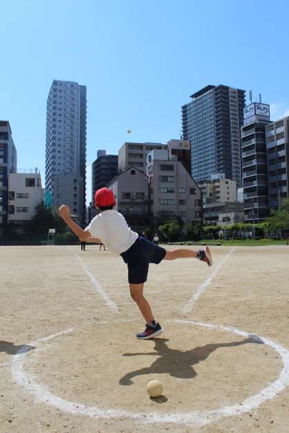 ボールが大きいので、うまく投げられない中、がんばっていました。何m投げることができたか、ご家庭で聞いてくださいね。