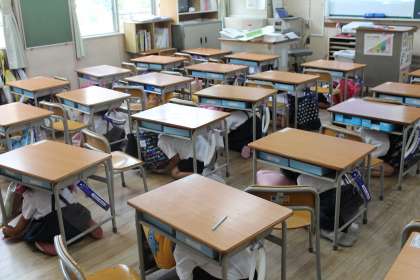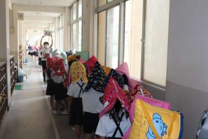 机の下に入っているときや、廊下に並ぶときにもおしゃべりすることなく、担任の先生の指示をしっかり聞き、行動することができました。自分や友だちの命を守るために、どうすればいいのかしっかり学習することができました。
