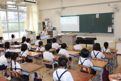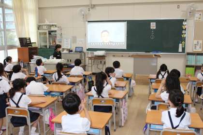 毎週、月曜日の朝に行っている児童朝会ですが、子どもたちの体力が落ちていることや、これから本格的に迎える夏の暑さ対策を兼ねて、涼しくなるまで教室で「Teams」を使った放送朝会をすることにしました。
