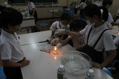 集気びんに1:二酸化炭素と2:酸素を入れ、その中に火をつけたろうそくを入れ、どちらの気体がものを燃やすはたらきがあるのかを調べていました。