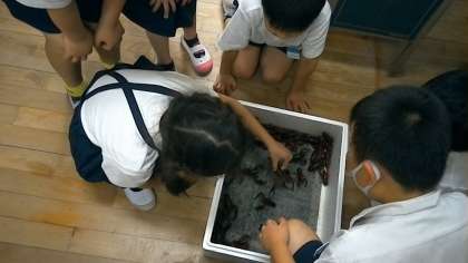 それぞれの班で1匹ずつお世話をすることになり、自分たちが飼うザリガニに「ザリちゃん」「はさみくん」など名前を付けていました。お子さんのザリガニの名前が何になったかなど聞いてください。