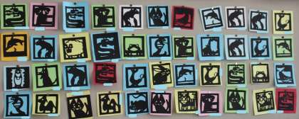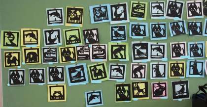 カッターを使った切り絵を掲示しています。子どもたちは20種類程度の見本から好きな生き物を選び、画用紙がちぎれないように集中してカッターて切っていました。