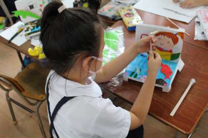 3年生では、磁石を裏から通して動かしたり、くっつけたりして遊べる作品を作っています。
