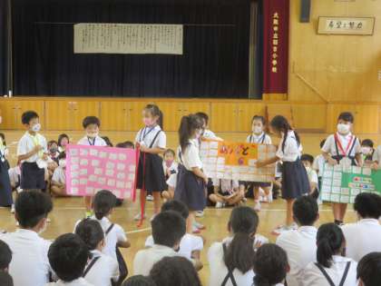 集会の最後は、6年生からの歌のプレゼントがあり、1年生からもお返しのメッセージとプレゼントを6年生に渡しました。
