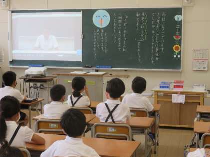 始業式は、いつもは講堂や運動場で行うのですが、今日は各教室でテレビ放送で行いました。