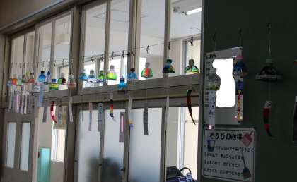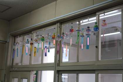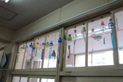 教室の掲示物の紹介です。図工の学習でペットボトルを使い、風鈴を作りました。教室に並んだ風鈴が風に揺られて鳴っているのを聞くと、少し涼しく感じることができます。季節を感じることができる素敵な作品になっています。